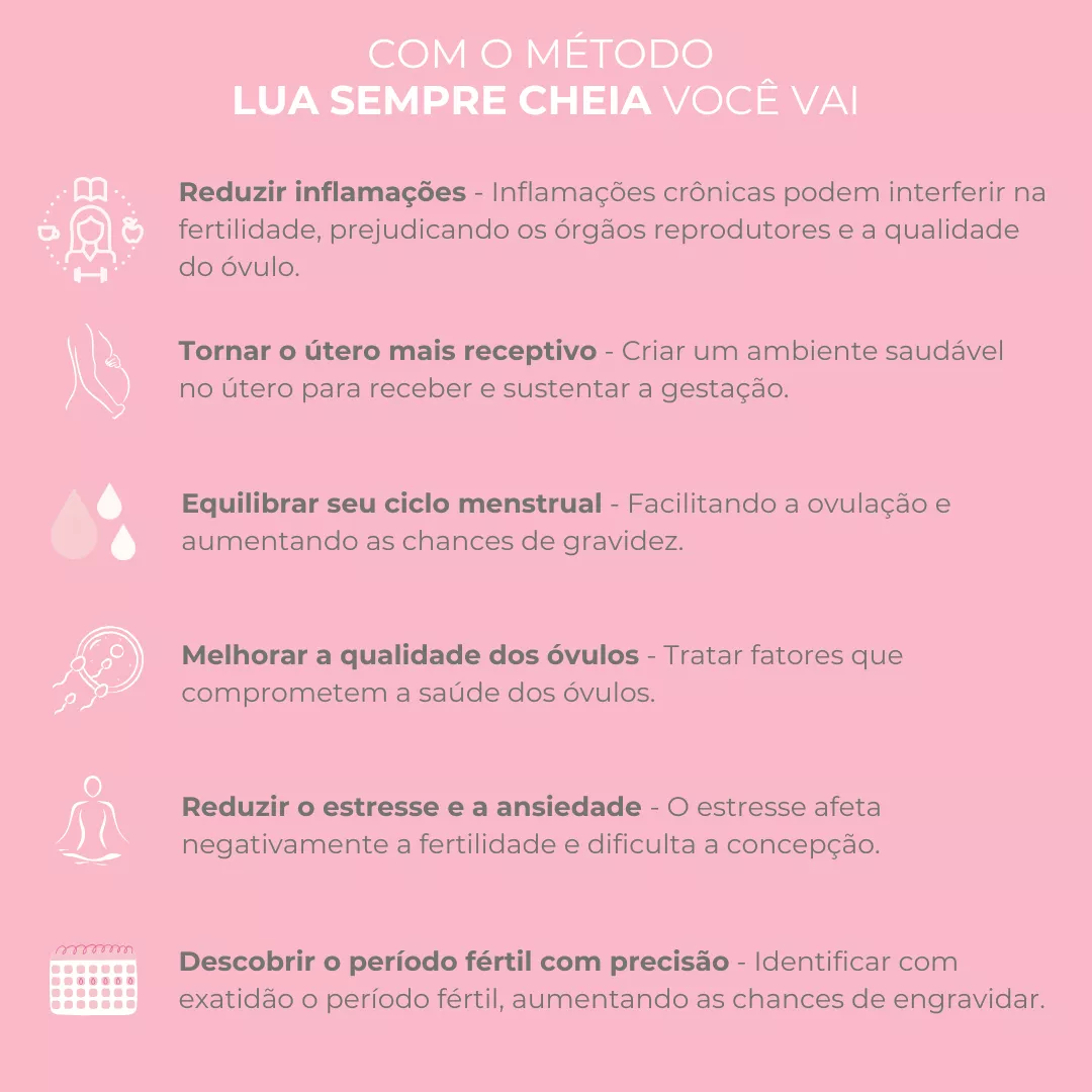 O Método Lua Sempre Cheia é baseado em técnicas respaldadas por estudos na área de saúde reprodutiva, respeitando o ciclo menstrual e tratando tanto o corpo físico quanto os aspectos emocionais e energéticos, equilibrando o corpo e limpando traumas uterinos e criando um ambiente ideal para a concepção.